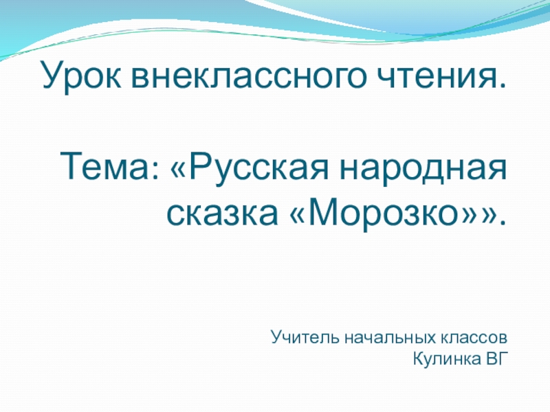 Слайд 1Урок внеклассного чтения. Тема: «Русская народная сказка «Морозко»». Учитель начальных классов Кулинка ВГ