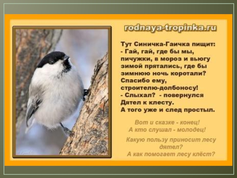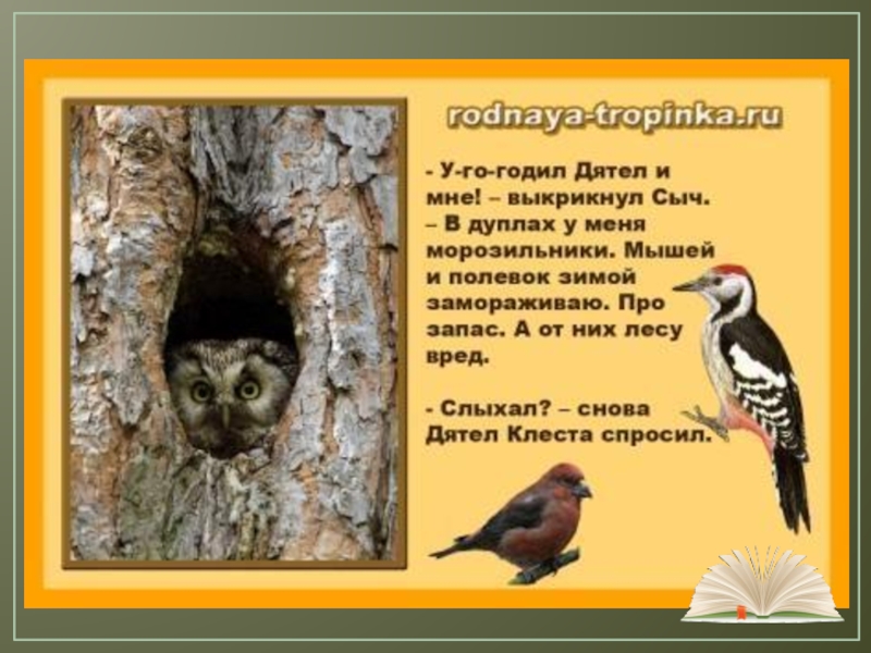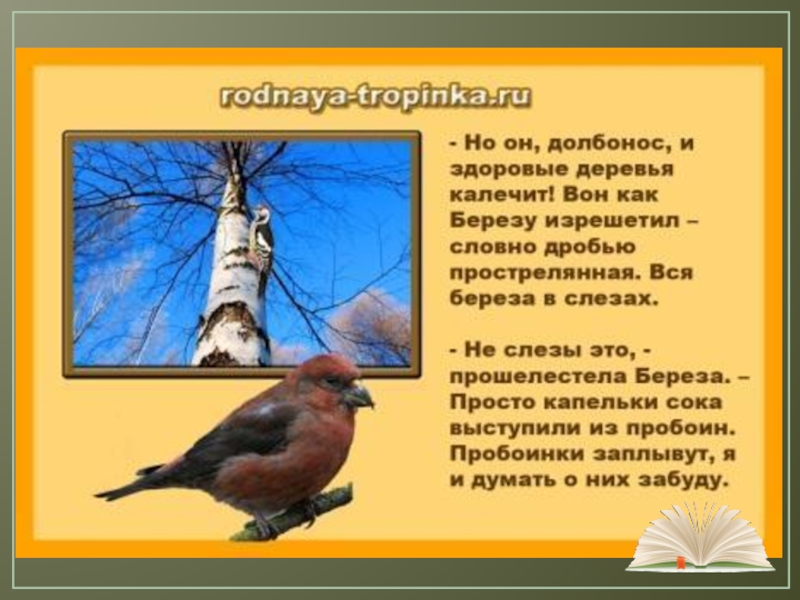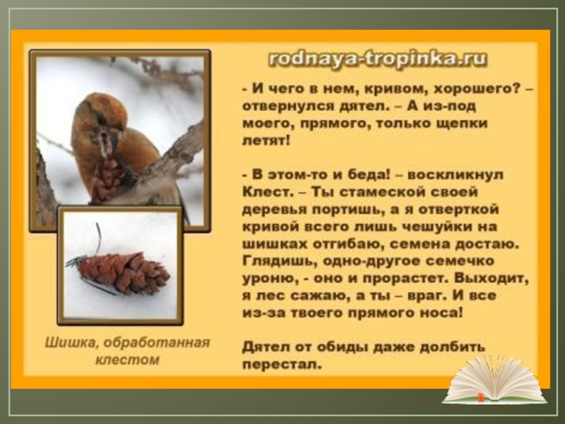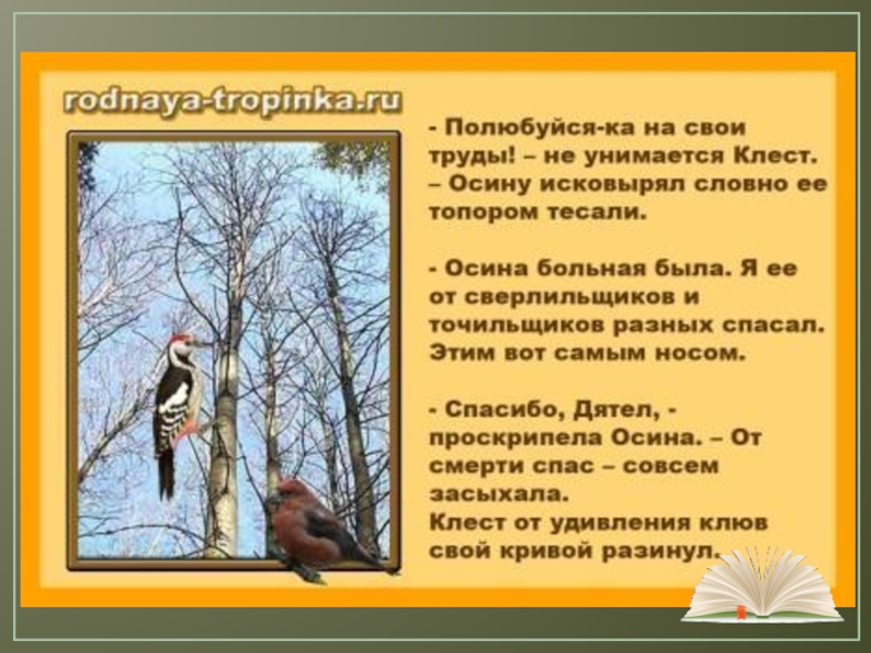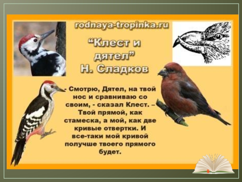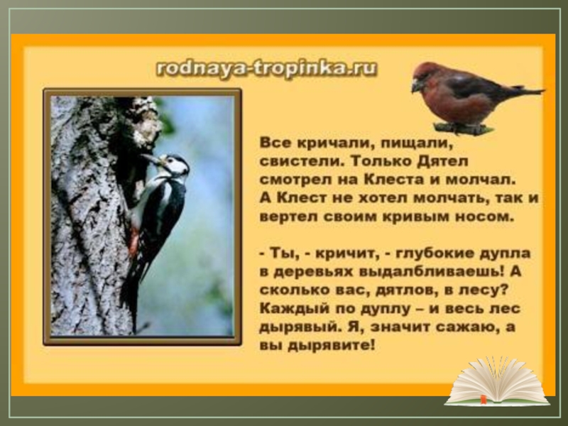 Презентация, доклад к уроку внеклассного чтения Клёст и дятел