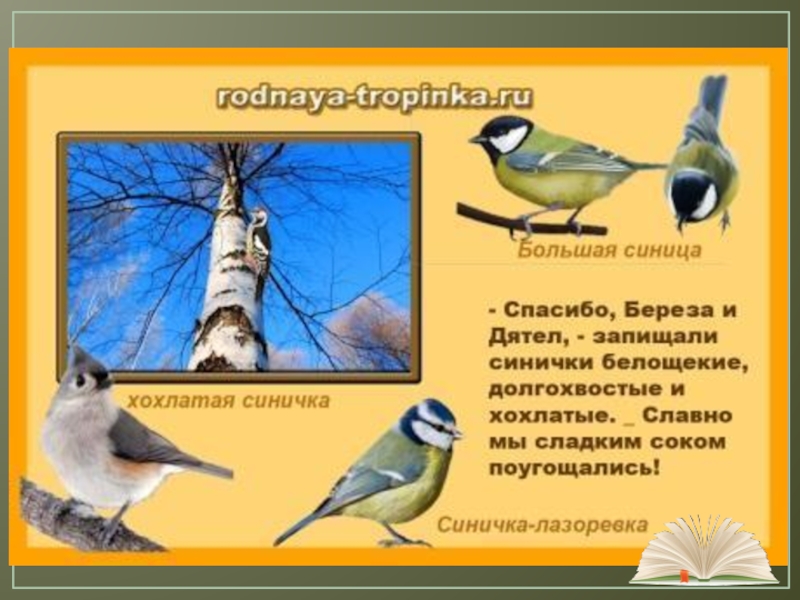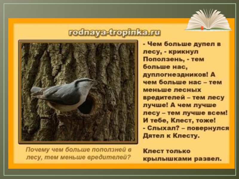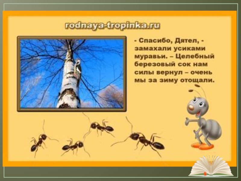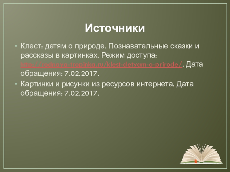 ИсточникиКлест: детям о природе. Познавательные сказки и рассказы в картинках. Режим доступа: http://rodnaya-tropinka.ru/klest-detyam-o-prirode/. Дата обращения: 7.02.2017.Картинки и