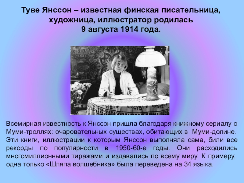 Всемирная известность к Янссон пришла благодаря книжному сериалу о Муми-троллях: очаровательных существах, обитающих в Муми-долине. Эти книги, иллюстрации к которым Янссон выполняла сама, били все рекорды по популярности в 1950-60-е годы. Они расходились многомиллионными тиражами и издавались по всему миру. К примеру, одна только «Шляпа волшебника» была переведена на 34 языка.