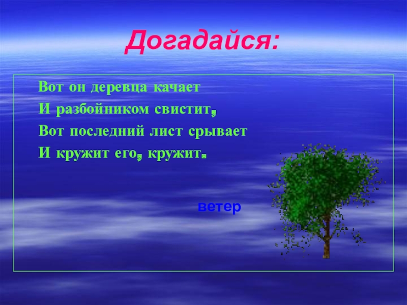 Догадайся:Вот он деревца качает  И разбойником свистит,  Вот последний лист срывает  И кружит его,