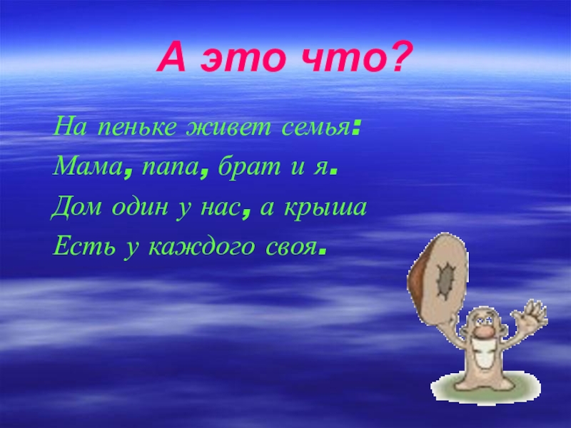 А это что?На пеньке живет семья:Мама, папа, брат и я.Дом один у нас, а крышаЕсть у каждого