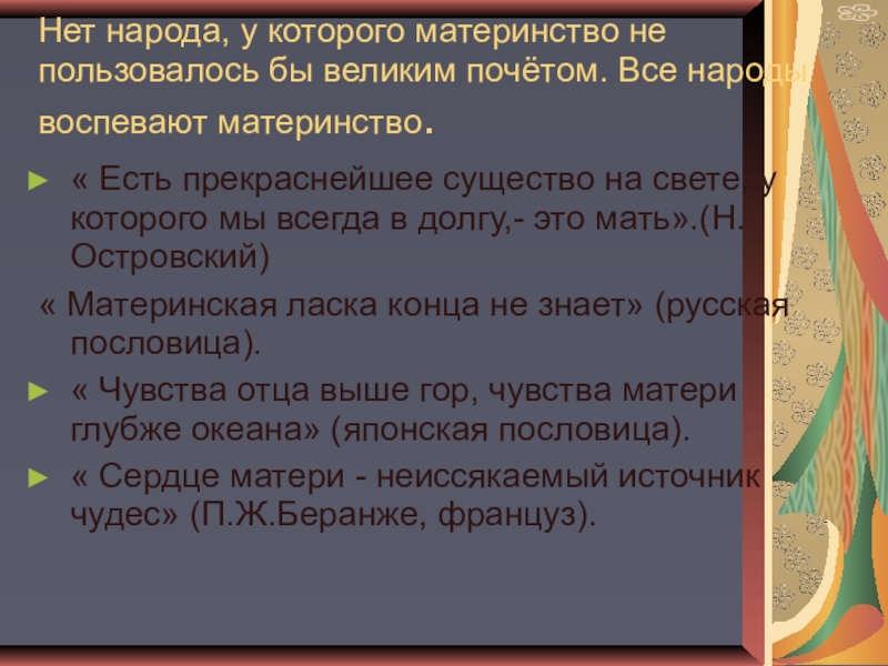 « Сердце матери - неиссякаемый источник чудес» (П.Ж.Беранже, француз).