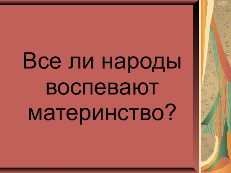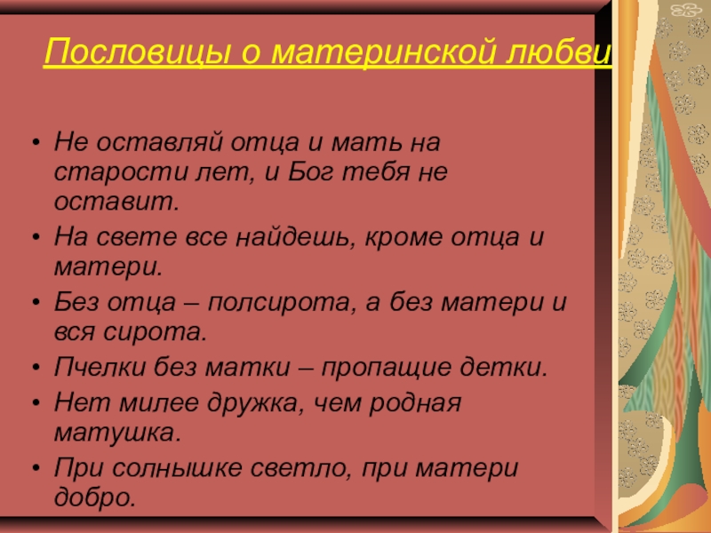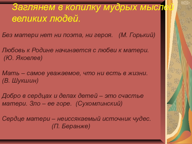 « Есть прекраснейшее существо на свете, у которого мы всегда в долгу,- это мать».(Н.Островский)