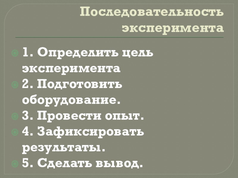 Последовательность эксперимента1. Определить цель эксперимента2. Подготовить оборудование.3. Провести опыт.4. Зафиксировать результаты.5. Сделать вывод.