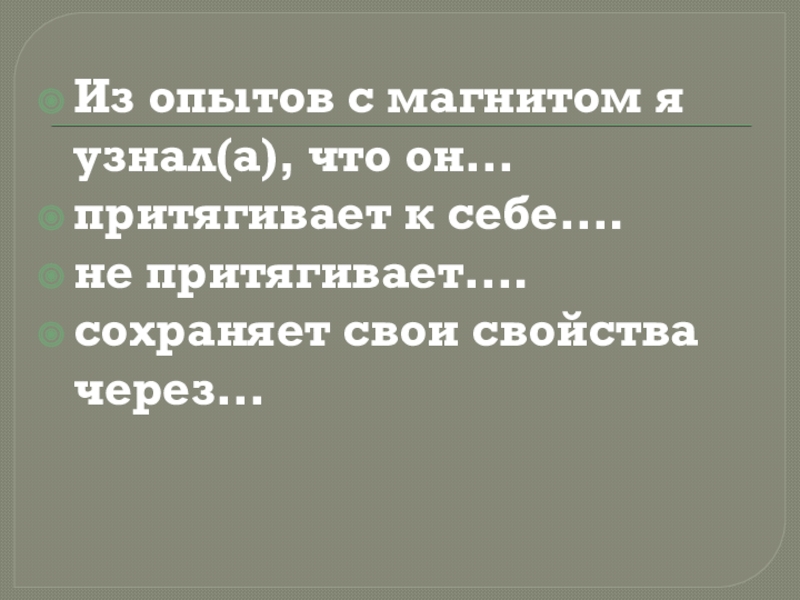Слайд 18Из опытов с магнитом я узнал(а), что он…