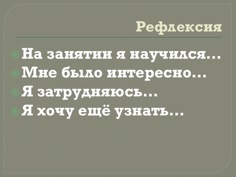 Рефлексия На занятии я научился…Мне было интересно…Я затрудняюсь…Я хочу ещё узнать…