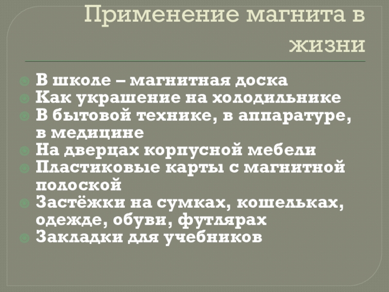 Применение магнита в жизниВ школе – магнитная доскаКак украшение на холодильникеВ бытовой технике, в аппаратуре, в медицине