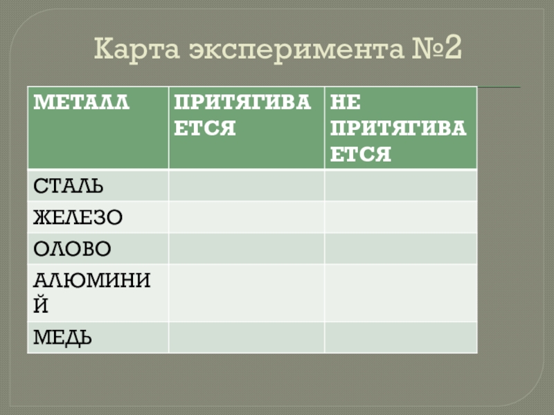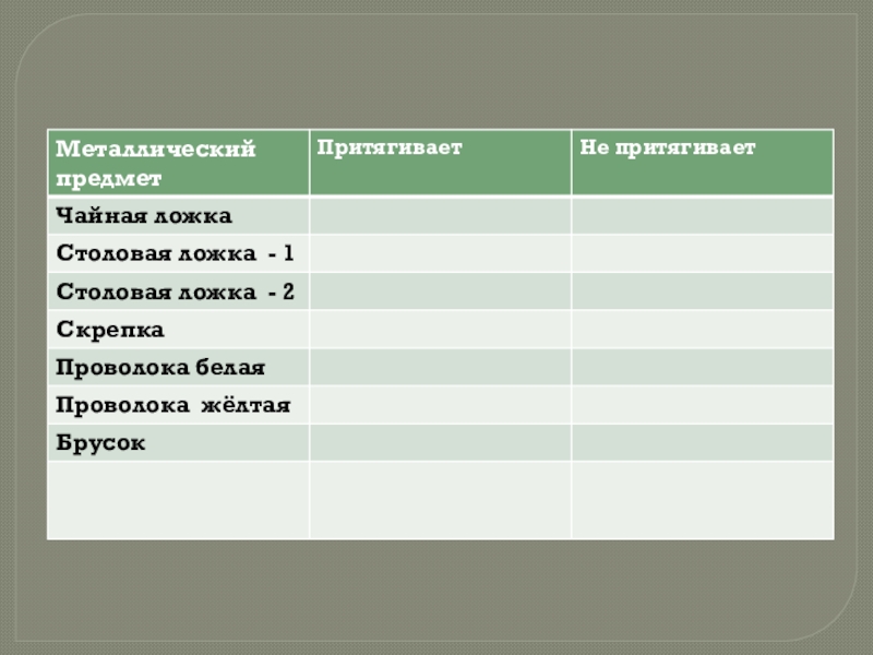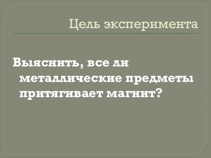 Цель экспериментаВыяснить, все ли металлические предметы притягивает магнит?