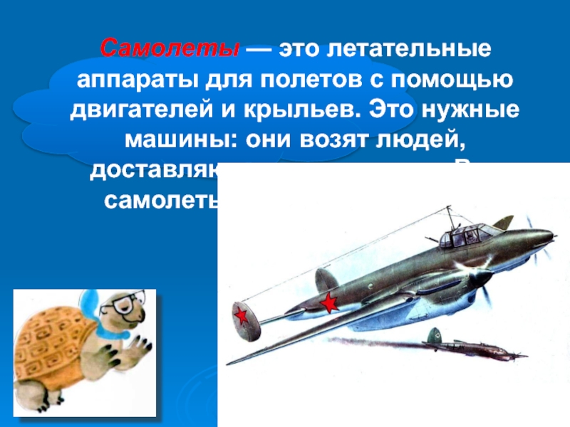 Самолеты — это летательные аппараты для полетов с помощью двигателей и крыльев. Это нужные машины: они возят