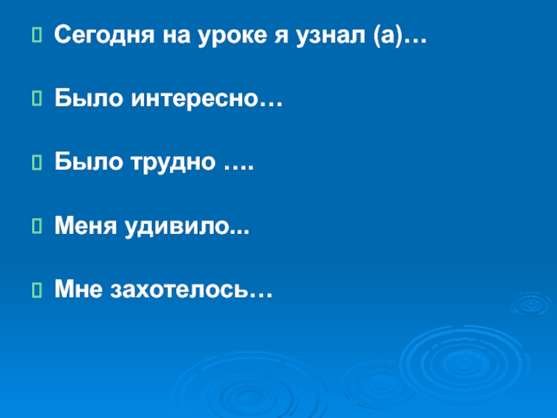 Сегодня на уроке я узнал (а)…Было интересно…Было трудно ….Меня удивило...Мне захотелось…