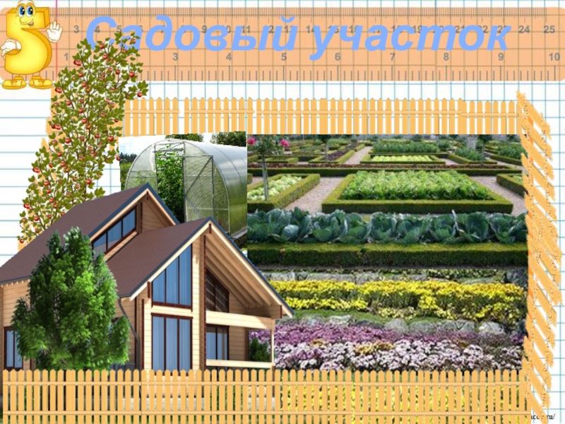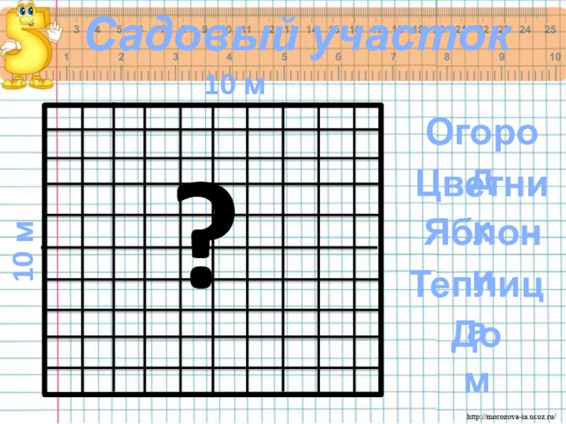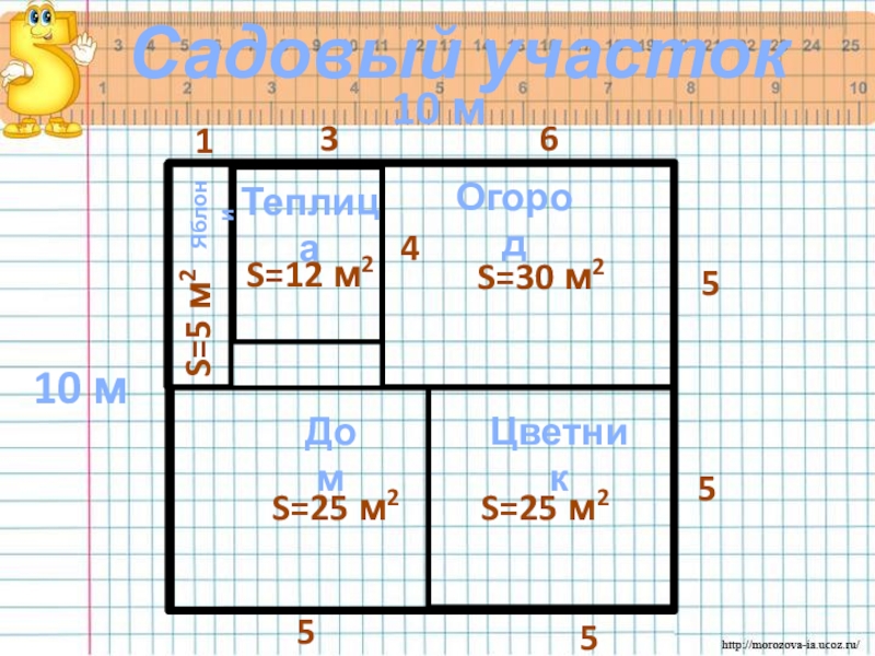 Садовый участок10 м10 мОгородЦветникТеплицаДомЯблониS=30 м2S=25 м2S=25 м2S=12 м2S=5 м265534155