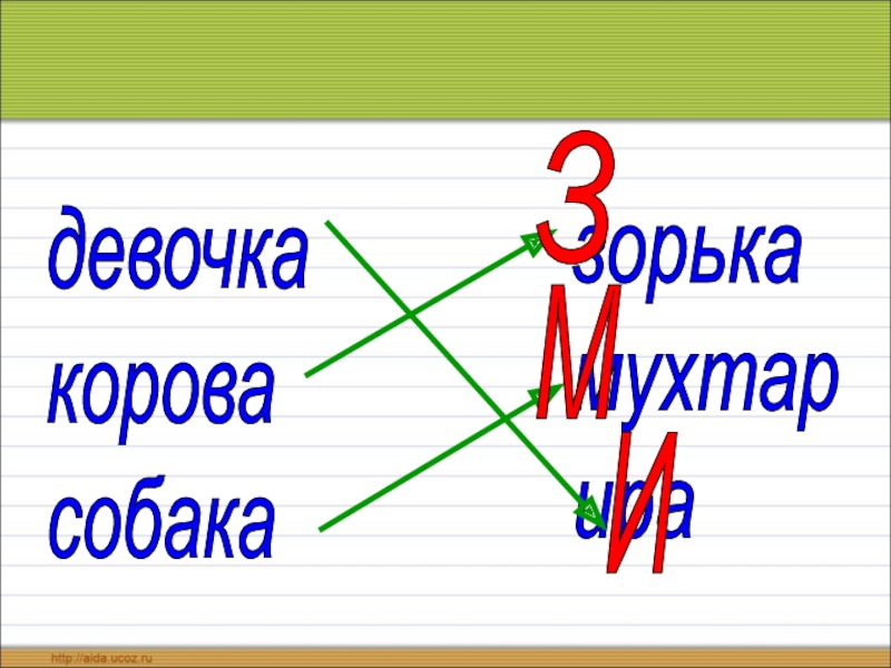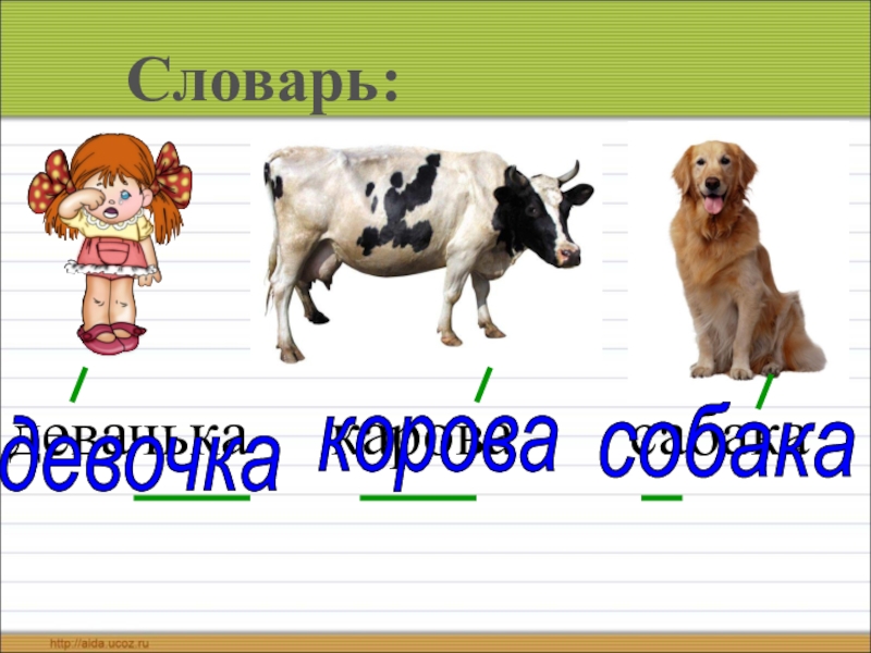 девачька   карова    сабакаСловарь:девочкакоровасобака