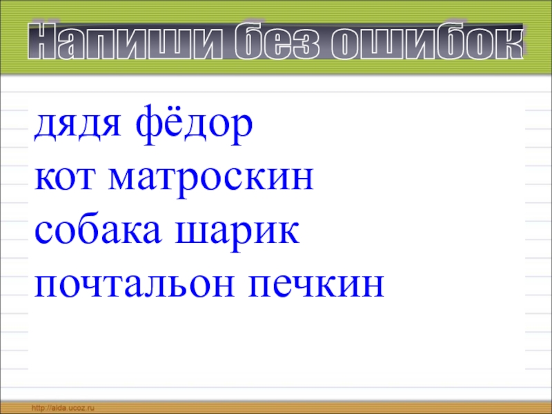 дядя фёдоркот матроскинсобака шарикпочтальон печкин Напиши без ошибок