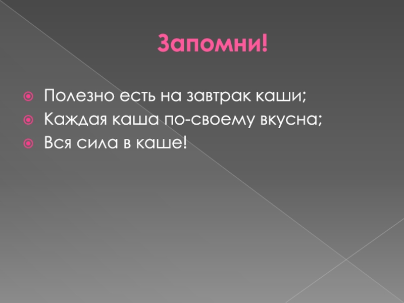 Запомни!Полезно есть на завтрак каши;Каждая каша по-своему вкусна;Вся сила в каше!