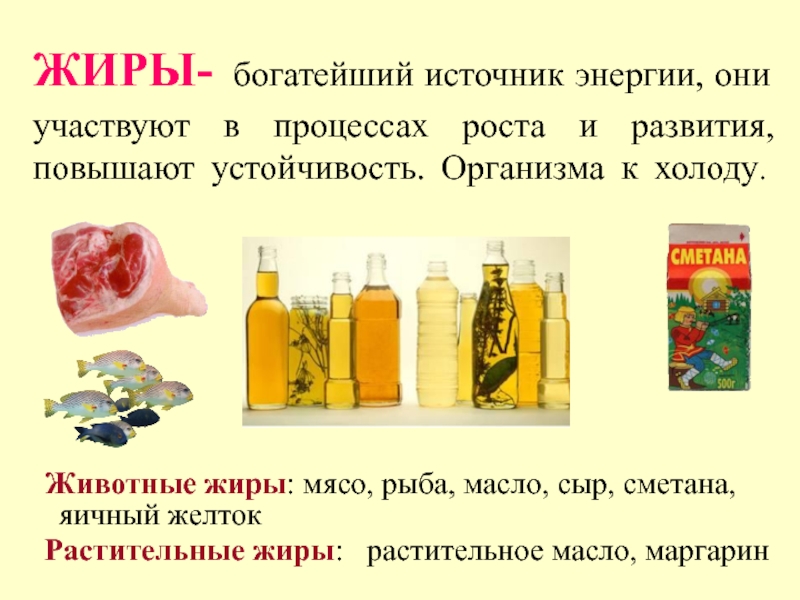 ЖИРЫ- богатейший источник энергии, они участвуют в процессах роста и развития, повышают устойчивость. Организма к холоду.