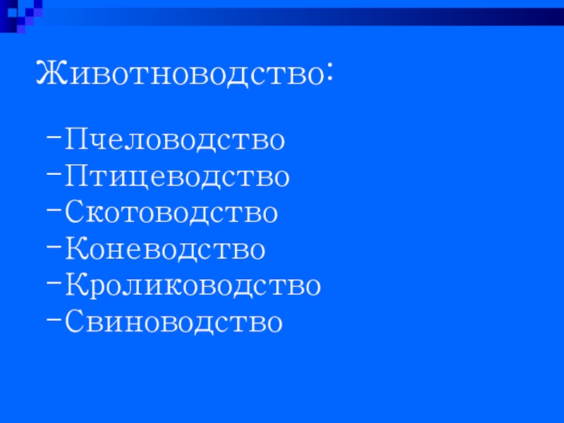 Животноводство: -Пчеловодство -Птицеводство -Скотоводство -Коневодство -Кролиководство -Свиноводство