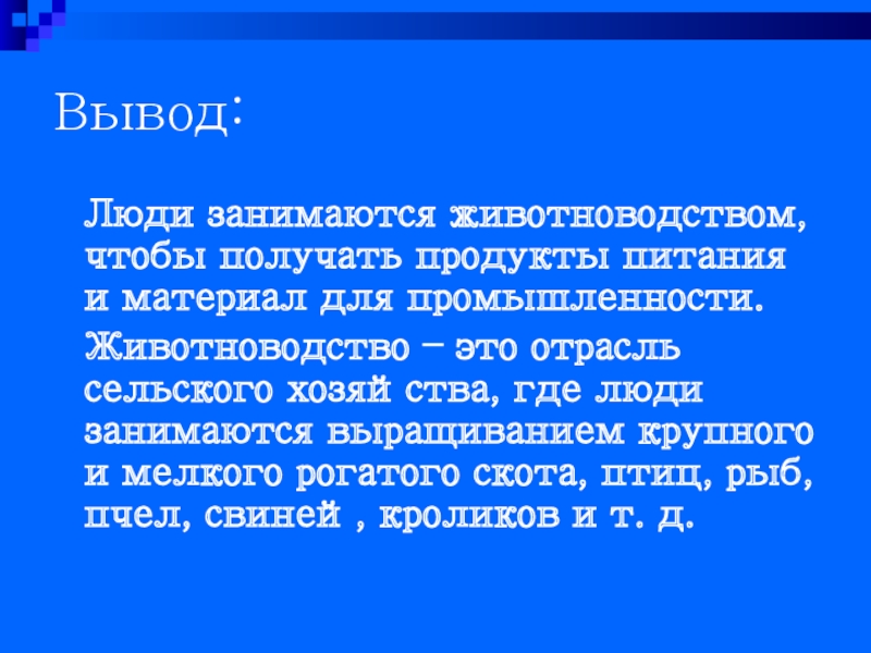 Вывод:Люди занимаются животноводством, чтобы получать продукты питания и материал для промышленности.Животноводство – это отрасль сельского хозяйства, где