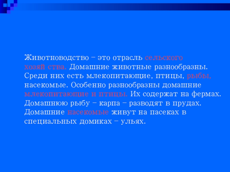 Животноводство – это отрасль сельского хозяйства. Домашние животные разнообразны. Среди них есть млекопитающие, птицы, рыбы, насекомые. Особенно