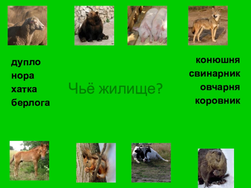 Чьё жилище?дуплонорахаткаберлогаконюшнясвинарниковчарнякоровник