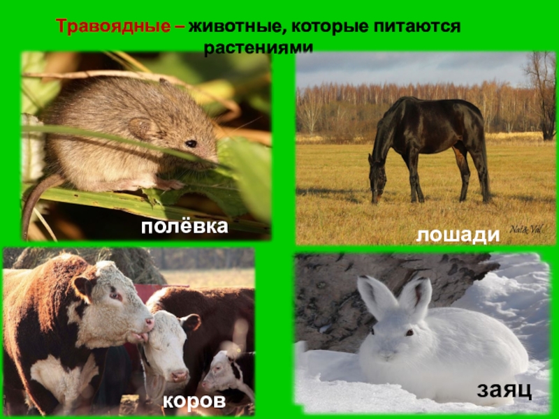 Травоядные – животные, которые питаются растениямиполёвкалошадикоровазаяц