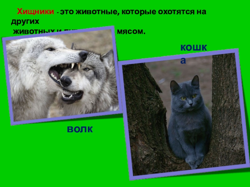Хищники - это животные, которые охотятся на других животных и питаются их мясом.волккошка