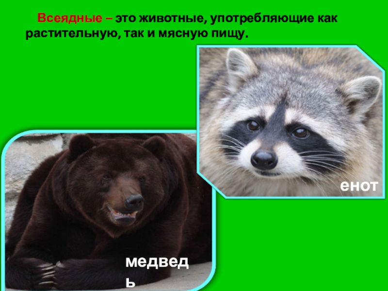 Всеядные – это животные, употребляющие как растительную, так и мясную пищу.медведьенот