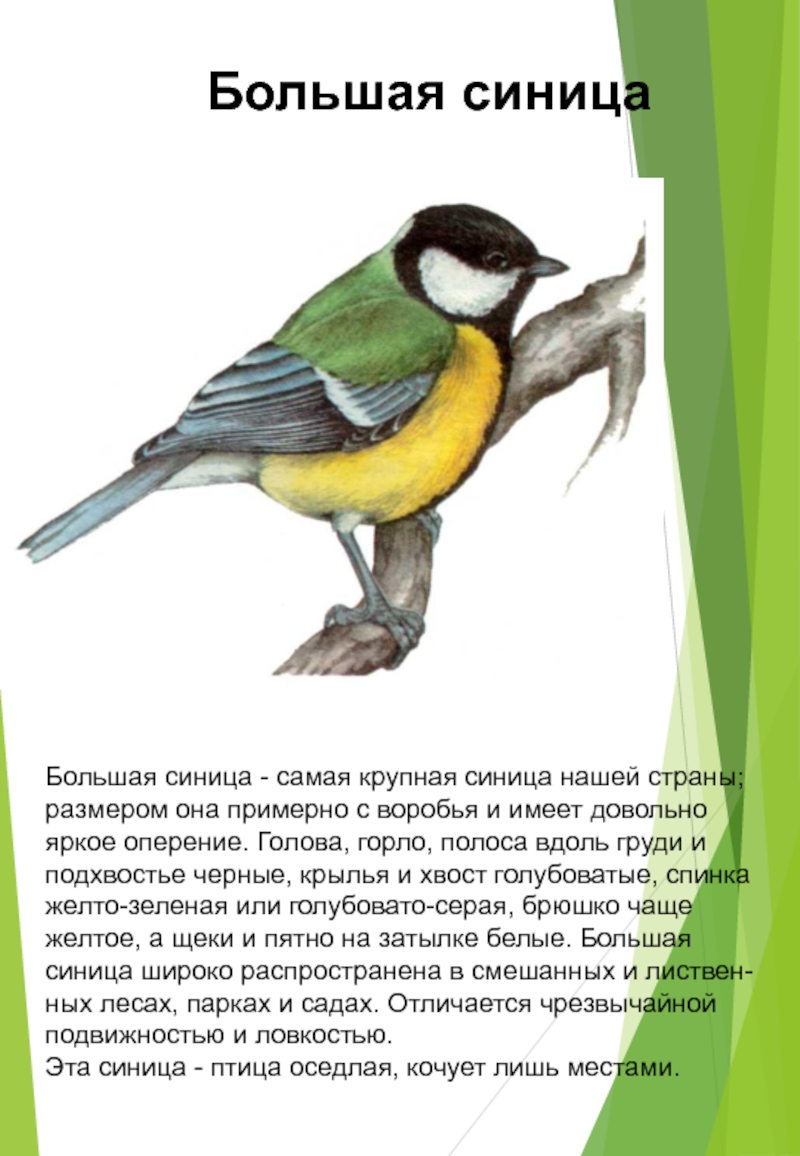 с воробья и имеет довольно яркое оперение. Голова, горло, полоса вдоль груди и подхвостье черные, крылья и хвост голубоватые, спинка желто-зеленая или голубовато-серая, брюшко чаще желтое, а щеки и пятно на затылке белые. Большая синица широко распространена в смешанных и листвен-ных лесах, парках и садах. Отличается чрезвычайной подвижностью и ловкостью.
