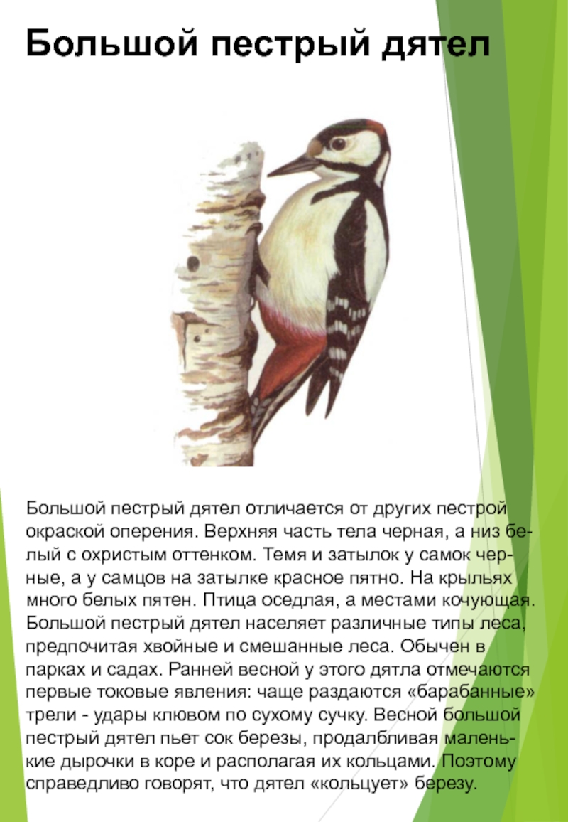 Большой пестрый дятел населяет различные типы леса, предпочитая хвойные и смешанные леса. Обычен в парках и садах. Ранней весной у этого дятла отмечаются первые токовые явления: чаще раздаются «барабанные» трели - удары клювом по сухому сучку. Весной большой пестрый дятел пьет сок березы, продалбливая малень-кие дырочки в коре и располагая их кольцами. Поэтому справедливо говорят, что дятел «кольцует» березу.