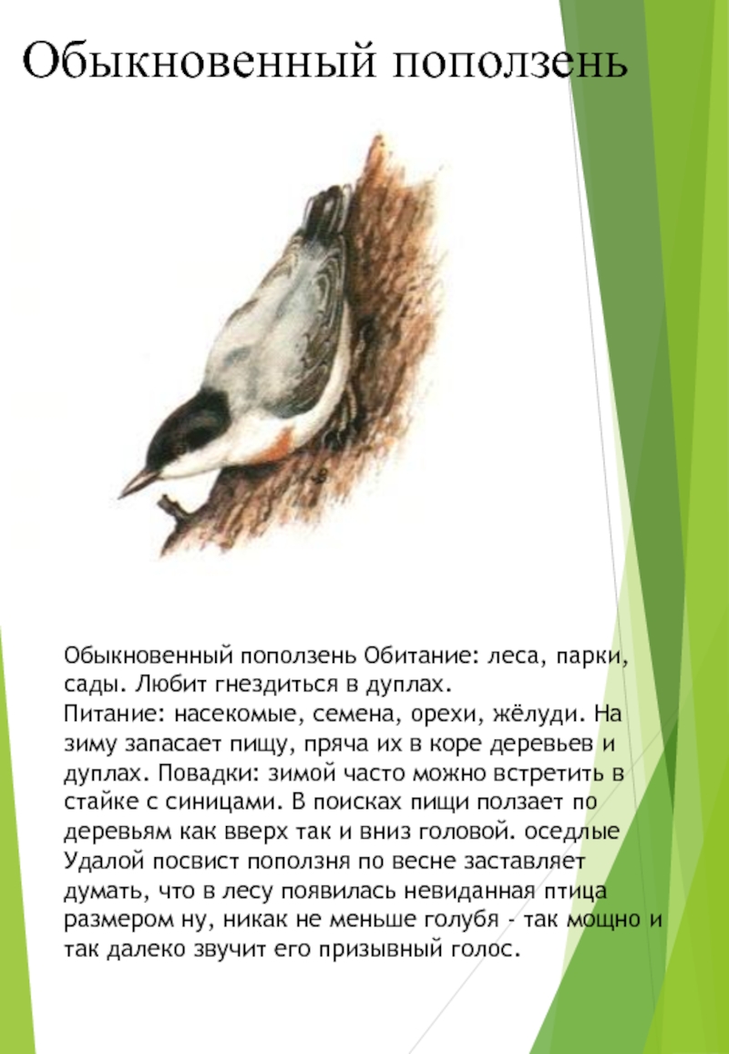 семена, орехи, жёлуди. На зиму запасает пищу, пряча их в коре деревьев и дуплах. Повадки: зимой часто можно встретить в стайке с синицами. В поисках пищи ползает по деревьям как вверх так и вниз головой. оседлые Удалой посвист поползня по весне заставляет думать, что в лесу появилась невиданная птица размером ну, никак не меньше голубя - так мощно и так далеко звучит его призывный голос.