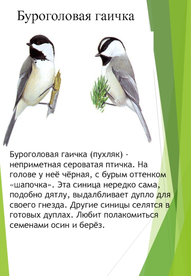 неё чёрная, с бурым оттенком «шапочка». Эта синица нередко сама, подобно дятлу, выдалбливает дупло для своего гнезда. Другие синицы селятся в готовых дуплах. Любит полакомиться семенами осин и берёз.