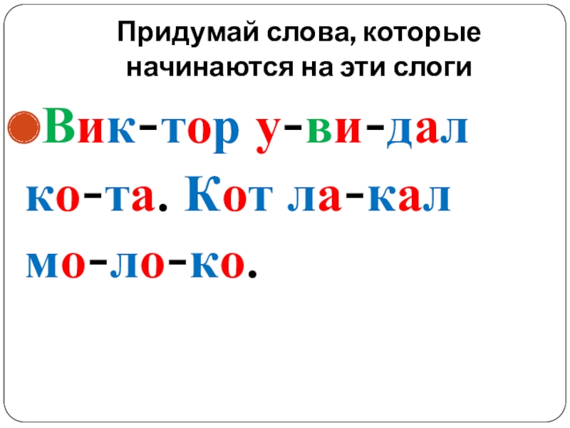 Придумай слова, которые начинаются на эти слогиВик-тор у-ви-далко-та. Кот ла-кал мо-ло-ко.