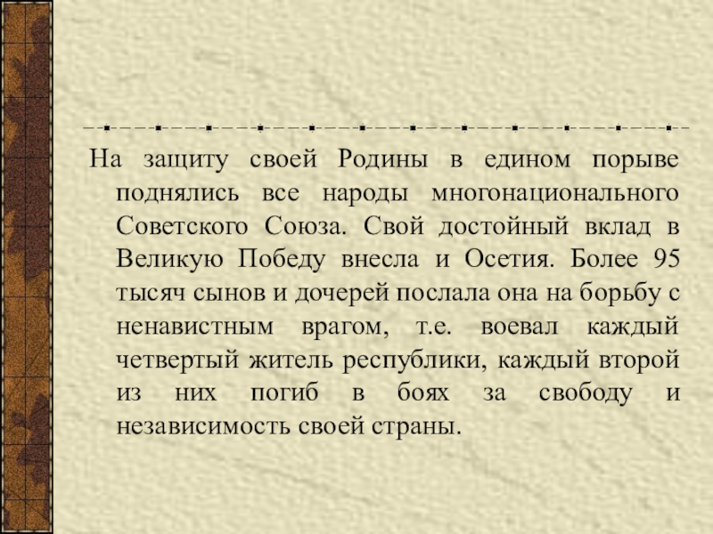 Советского Союза. Свой достойный вклад в Великую Победу внесла и Осетия. Более 95 тысяч сынов и дочерей послала она на борьбу с ненавистным врагом, т.е. воевал каждый четвертый житель республики, каждый второй из них погиб в боях за свободу и независимость своей страны.