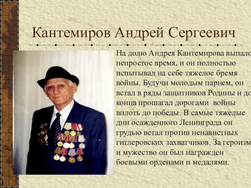 полностью испытывал на себе тяжелое бремя войны. Будучи молодым парнем, он встал в ряды защитников Родины и до конца прошагал дорогами войны вплоть до победы. В самые тяжелые дни осажденного Ленинграда он грудью встал против ненавистных гитлеровских захватчиков. За героизм и мужество он был награжден боевыми орденами и медалями.