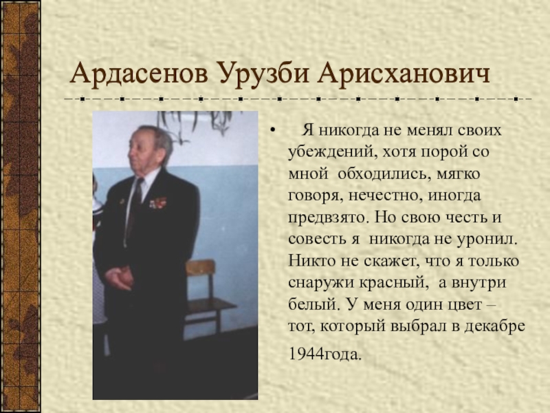менял своих убеждений, хотя порой со мной обходились, мягко говоря, нечестно, иногда предвзято. Но свою честь и совесть я никогда не уронил. Никто не скажет, что я только снаружи красный, а внутри белый. У меня один цвет – тот, который выбрал в декабре 1944года.