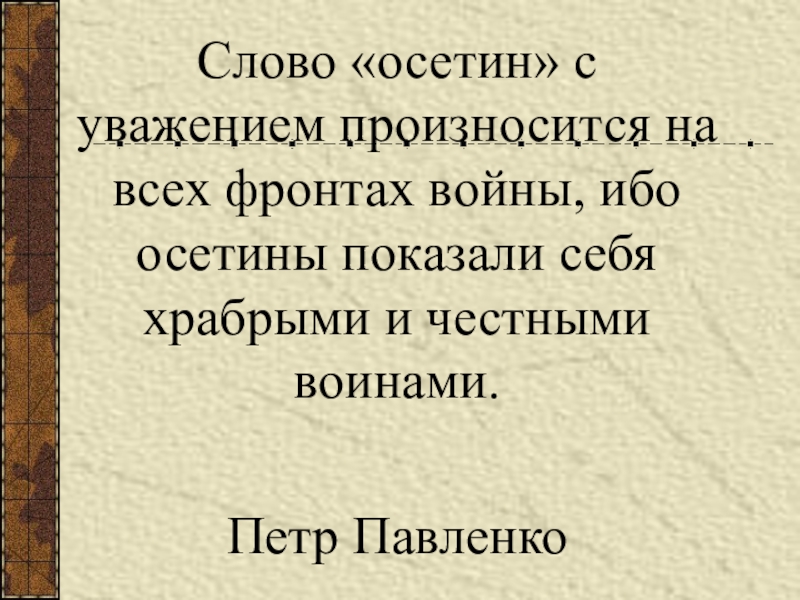Слайд 9Слово «осетин» с уважением произносится на всех фронтах войны, ибо осетины