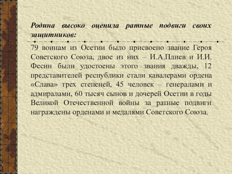 присвоено звание Героя Советского Союза, двое из них – И.А.Плиев и И.И.Фесин были удостоены этого звания дважды, 12 представителей республики стали кавалерами ордена «Слава» трех степеней, 45 человек – генералами и адмиралами, 60 тысяч сынов и дочерей Осетии в годы Великой Отечественной войны за ратные подвиги награждены орденами и медалями Советского Союза.