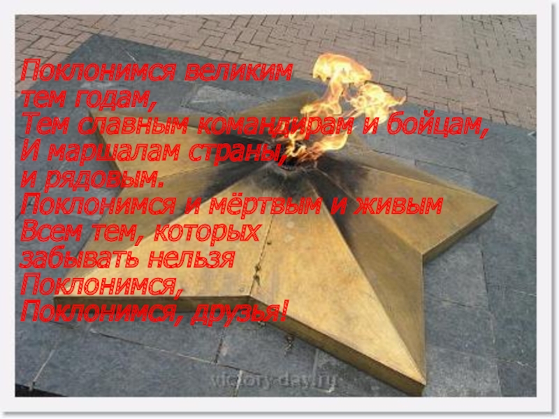 Поклонимся великимтем годам,Тем славным командирам и бойцам,И маршалам страны,и рядовым.Поклонимся и мёртвым и живымВсем тем, которыхзабывать нельзяПоклонимся,Поклонимся,
