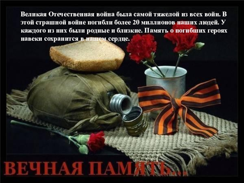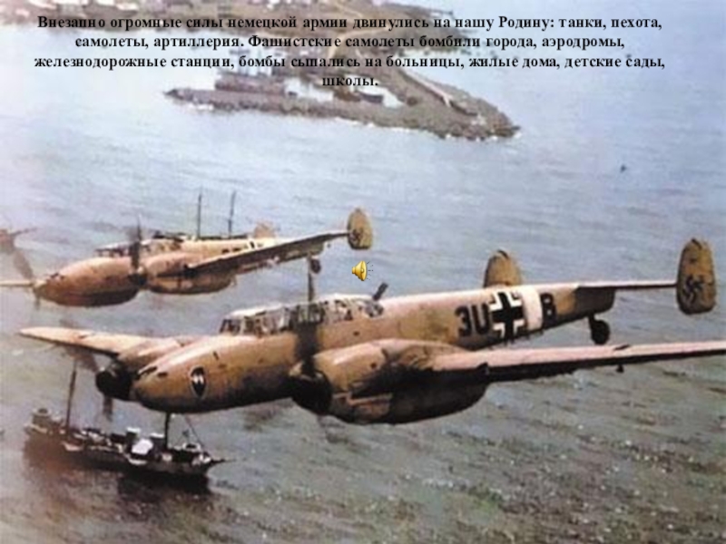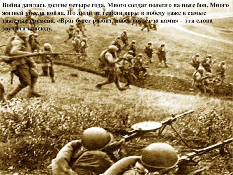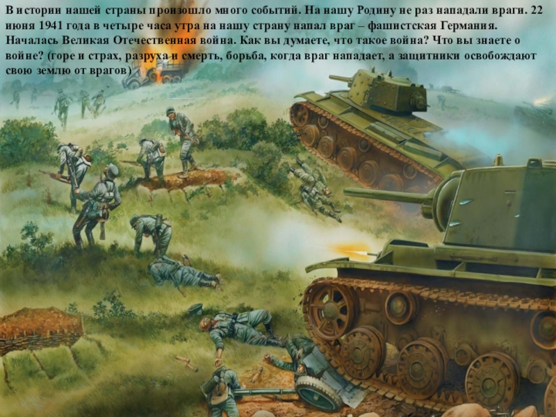 раз нападали враги. 22 июня 1941 года в четыре часа утра на нашу страну напал враг – фашистская Германия. Началась Великая Отечественная война. Как вы думаете, что такое война? Что вы знаете о войне? (горе и страх, разруха и смерть, борьба, когда враг нападает, а защитники освобождают свою землю от врагов)
