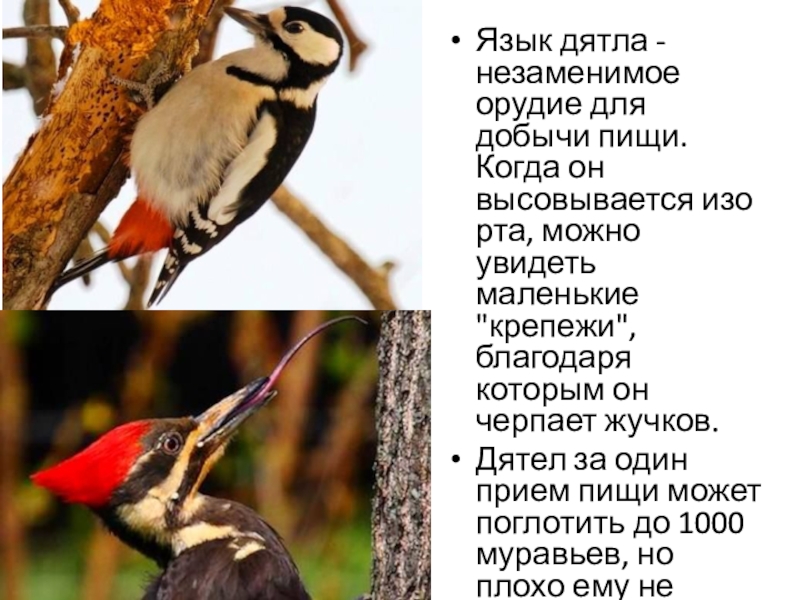 Слайд 5Язык дятла - незаменимое орудие для добычи пищи. Когда он высовывается