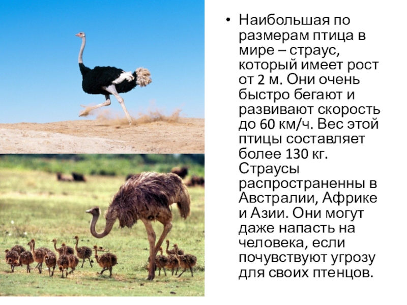 от 2 м. Они очень быстро бегают и развивают скорость до 60 км/ч. Вес этой птицы составляет более 130 кг. Страусы распространенны в Австралии, Африке и Азии. Они могут даже напасть на человека, если почувствуют угрозу для своих птенцов.