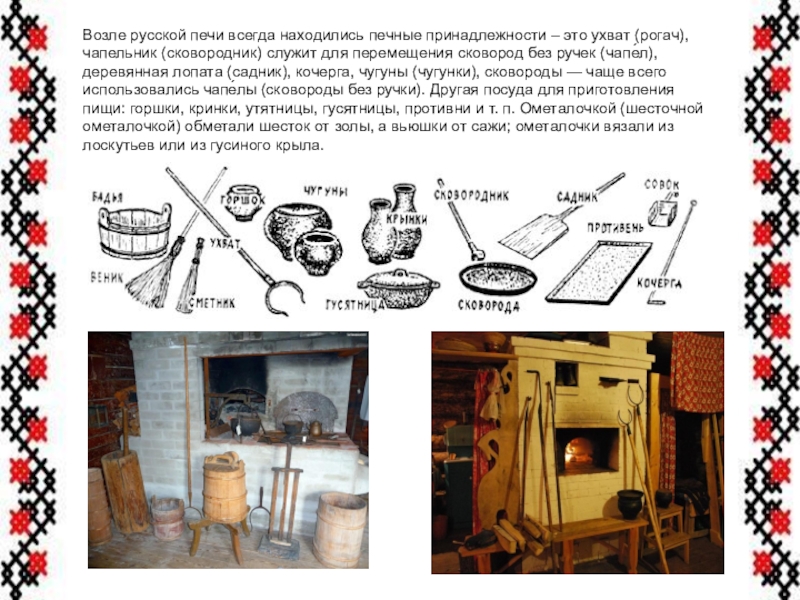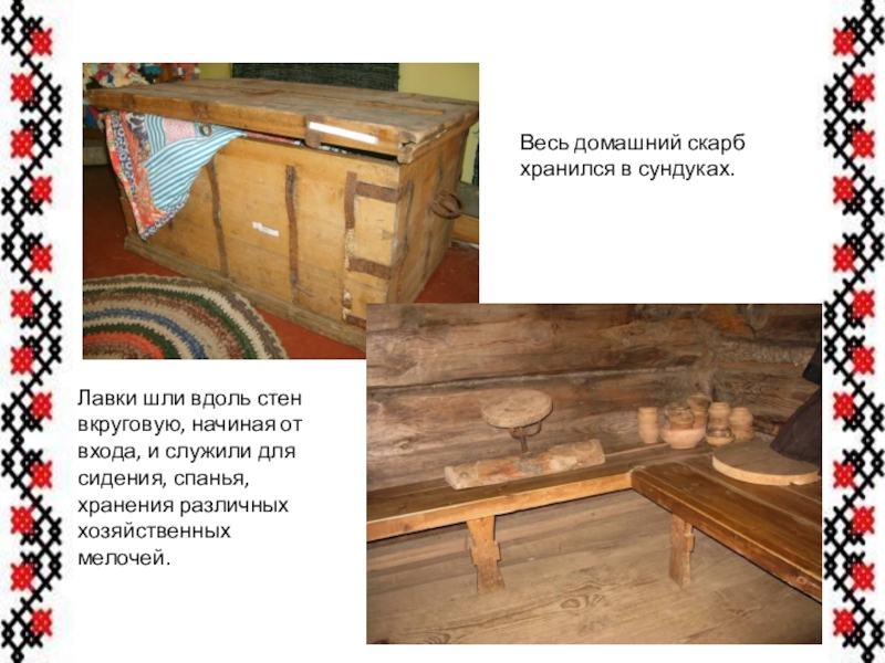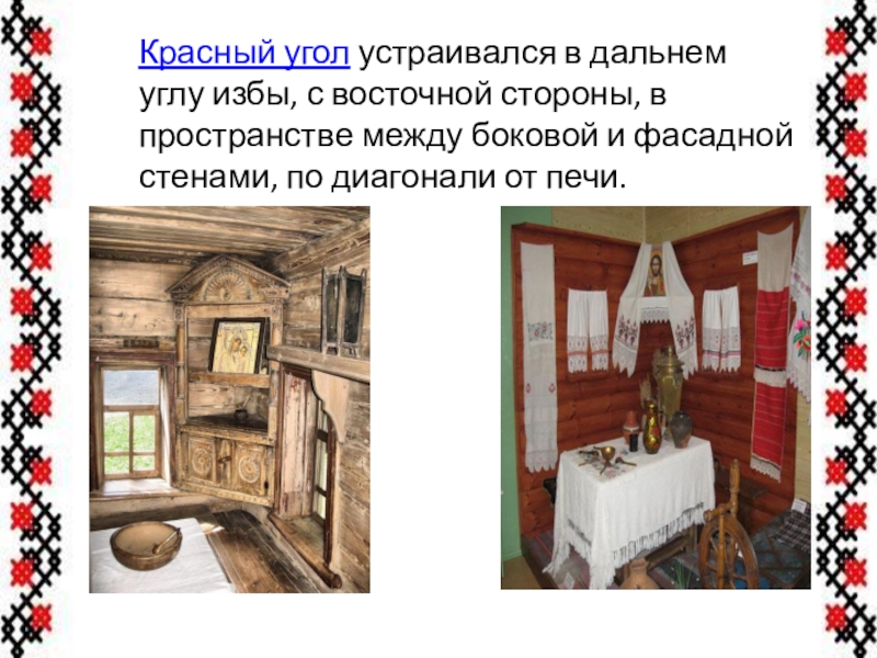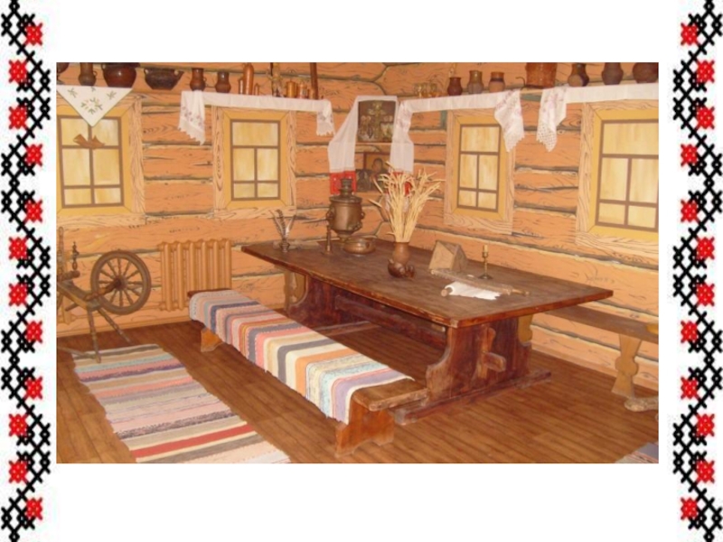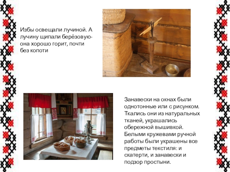 Занавески на окнах были однотонные или с рисунком. Ткались они из натуральных тканей, украшались обережной вышивкой. Белыми кружевами ручной работы были украшены все предметы текстиля: и скатерти, и занавески и подзор простыни.