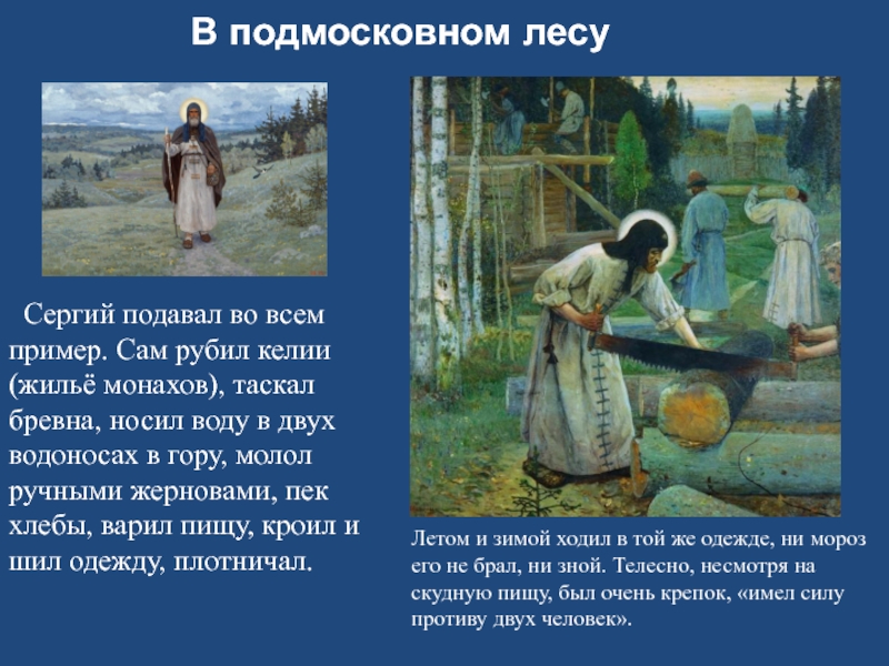 Летом и зимой ходил в той же одежде, ни мороз его не брал, ни зной. Телесно, несмотря на скудную пищу, был очень крепок, «имел силу противу двух человек».