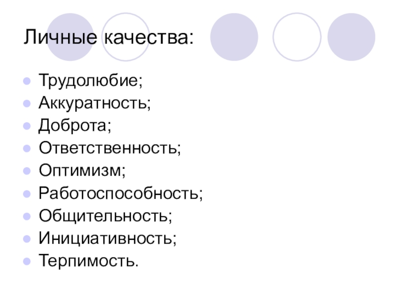 Личные качества:Трудолюбие;Аккуратность; Доброта;Ответственность;Оптимизм;Работоспособность;Общительность;Инициативность;Терпимость.