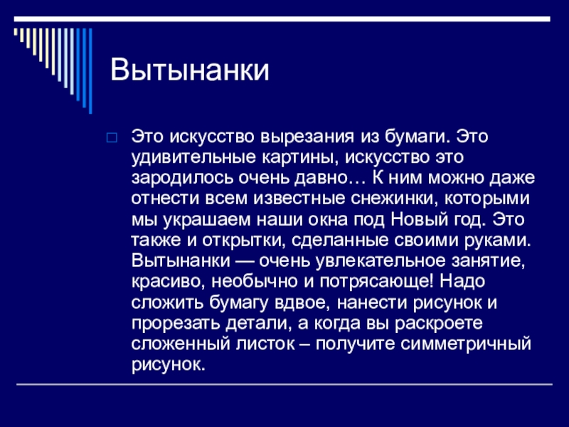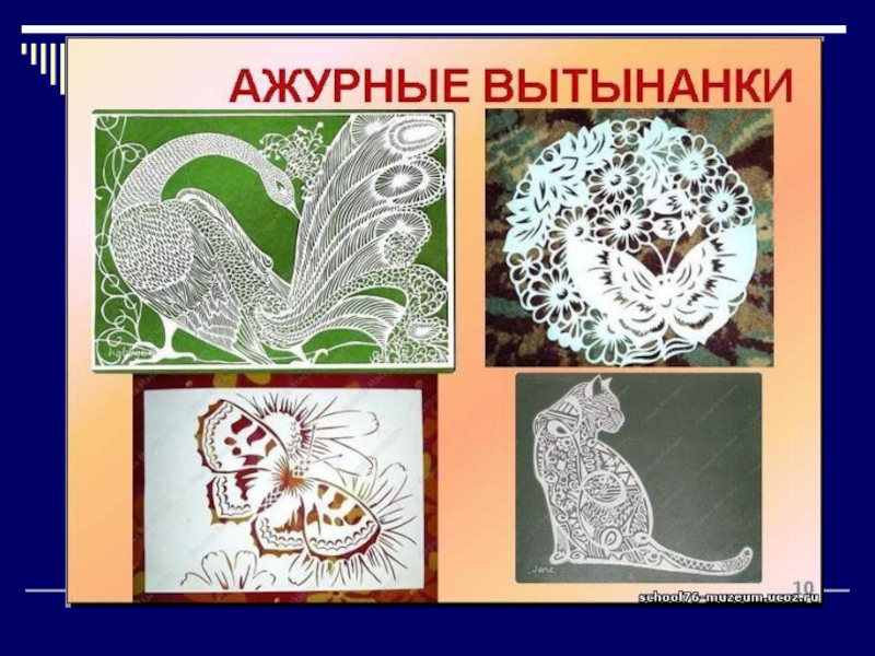 появились в VII-XII веке в Китае, на родине бумаги. Накануне праздника весны китайские женщины наклеивали на окна традиционные бумажные узоры, сюжеты в виде драконов, цветов, различных символов. В Западной Европе вытынанки были подобны графическим изображениям, это были аппликации на одном целом листе бумаги. Славянские народы использовали вытынанку, в основном, как декоративный элемент в народных традиционных орнаментах. Встречаются вытынанки в артефактах кочевых народов Алтая, на севере Европы, Балканах, у многих славянских народов.