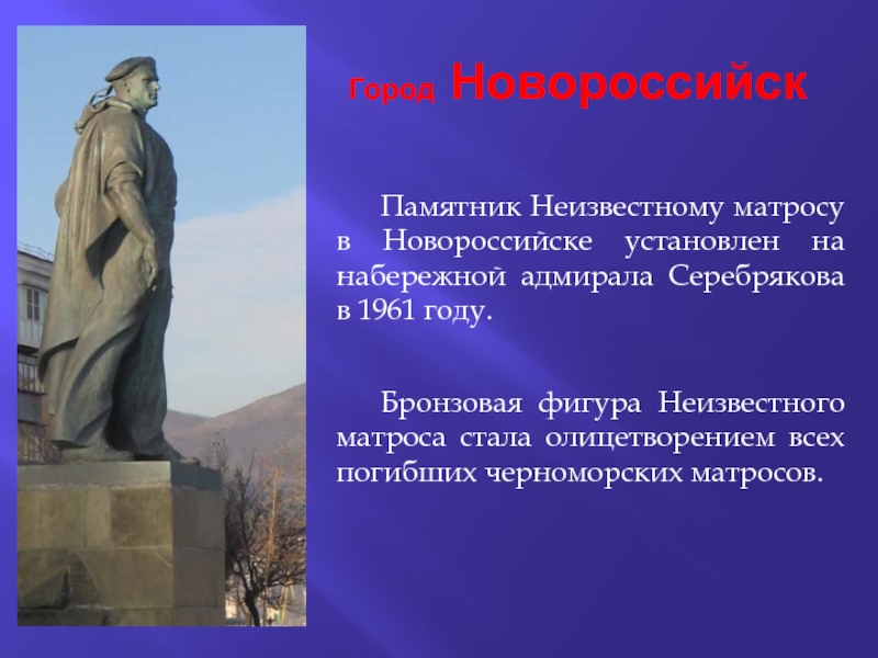 Бронзовая фигура Неизвестного матроса стала олицетворением всех погибших черноморских матросов.