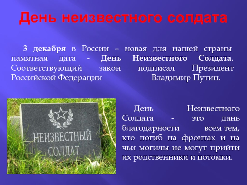 3 декабря в России – новая для нашей страны памятная дата - День Неизвестного Солдата. Соответствующий закон подписал Президент Российской Федерации Владимир Путин.
