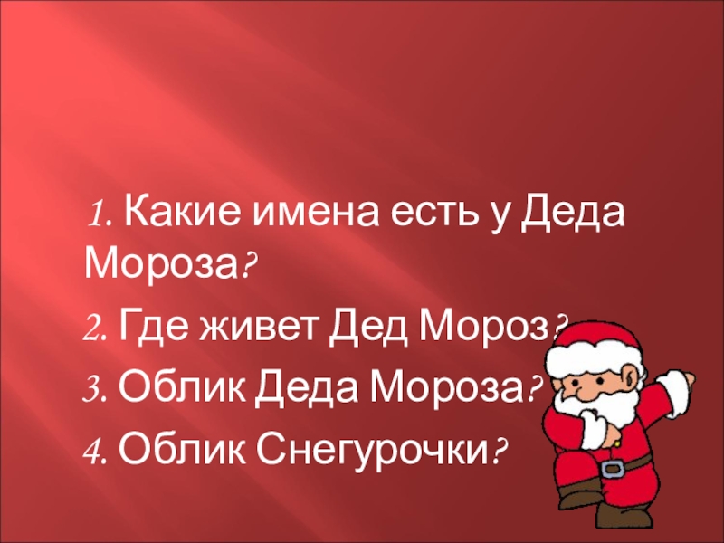 1. Какие имена есть у Деда Мороза? 2. Где живет Дед Мороз? 3. Облик Деда Мороза? 4. Облик Снегурочки?