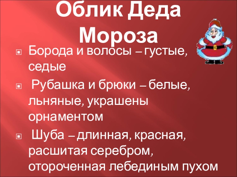 Облик Деда МорозаБорода и волосы – густые, седые Рубашка и брюки – белые, льняные, украшены орнаментом Шуба