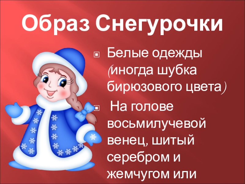 Образ СнегурочкиБелые одежды (иногда шубка бирюзового цвета) На голове восьмилучевой венец, шитый серебром и жемчугом или шапочка